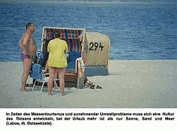 So hat sich der Badeurlaub, als die "systematische allmähliche Erzeugung von Hautkrebs durch Sonneneinstrahlung", zur beliebtesten Form der scheinbaren Erholung entwickelt. Dies hängt vermutlich mit dem geringen Flächenbedarf der Badetouristen zusammen, denn keine andere Erholungsart lässt sich so leicht standardisieren, mit ergänzenden Angeboten anreichern und auf so geringem Raum ansiedeln. Ein Wandel in der Tourismusentwicklung ist notwendig, da Tourismus mehr ist als nur "ökonomische Transaktion" und gewinnträchtiger Wirtschaftszweig. Er ist Bestandteil der Persönlichkeitsentwicklung, der Lebensqualität, der Kultur und der internationalen Beziehungen. Diese Funktion kann er aber nur erfüllen, wenn die Urlauber ihre Bedürfnislosigkeit aufgeben. Erst wenn die Touristen ihre Ansprüche anmelden und ihnen nicht nur ein hohes Niveau materieller Ausstattung wichtig ist, sondern mehr inhaltliche Qualitäten von der Reise verlangen, lassen sich neue Impulse erwarten.